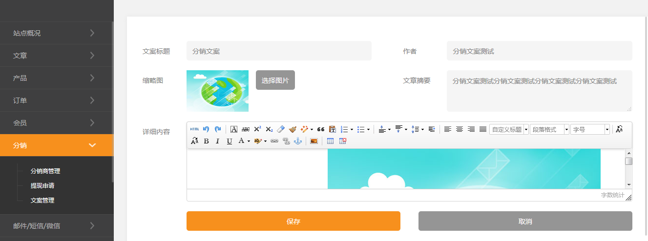 1、在网站后台依次点击  分销-》文案管理-》添加文案