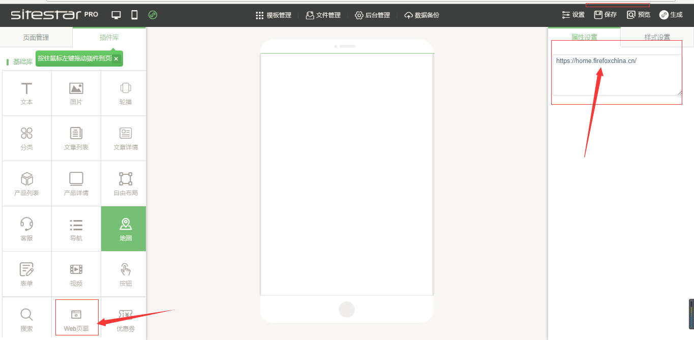 ①.编辑小程序,拖入Web-view插件,在“属性设置”中,输入网址链接,(网页链接仅支持Https,个人类型和海外类型的暂不支持,并且需要配置业务域名(web页面所用域名必须和业务域名一致)。
