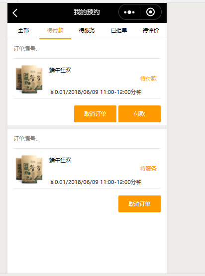 12.“用户中心”页面中有“我的预约”,点击之后,页面中会有订单的状态“待付款”、“待服务”“已拒单”“待评价”以及“全部”,点击都可以看到该状态下的订单内容: